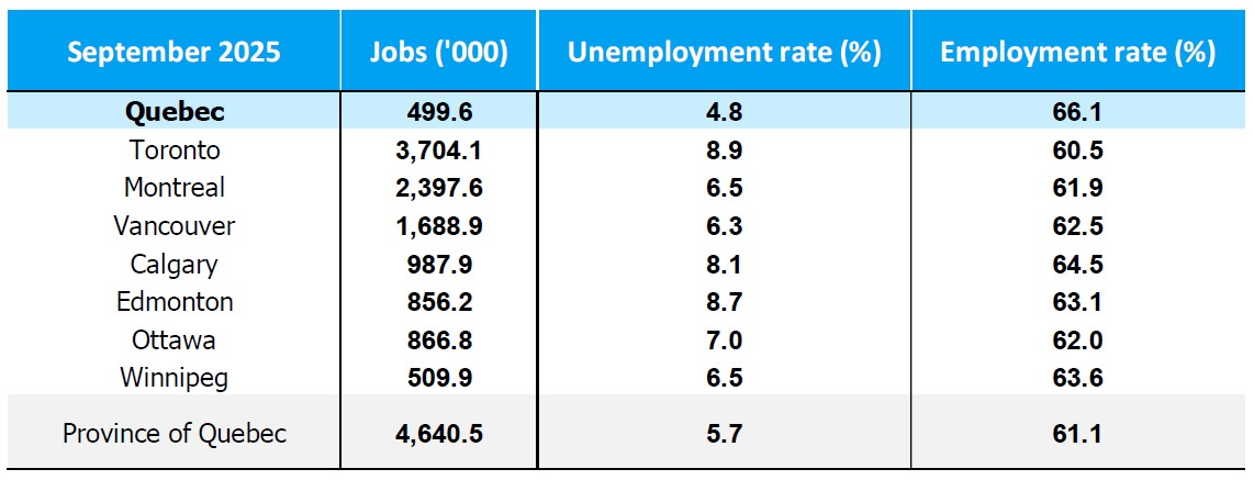 According to Statistics Canada’s Labour Force Survey (LFS), employment in the Québec City CMA recorded its sixth consecutive increase in September, reaching 499,600 jobs (+1.4%). Despite the ongoing uncertainty, this is a historic high. This evolution is supported in part by the growing labour force (+1.8%), which has now reached 524,700 people. Moreover, Québec City has maintained the lowest unemployment rate among the eight major Canadian CMAs (4.8%, +0.4 pp), placing it in second rank in the country, tied with Victoria. In this context, the employment rate has reached 66.1% (+0.9 pp).