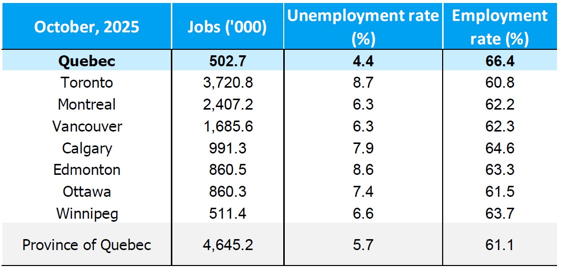 According to Statistics Canada’s Labour Force Survey (LFS), the labour market is starting the last quarter of 2025 on a positive note, marking a net gain of 3,100 jobs compared to September, bringing the total number of people employed to 502,700. In this context, the region maintains a favourable position with regard to unemployment, ranking second among all Canadian CMAs, behind Trois-Rivières and Victoria, which both registered a 4.2% unemployment rate. Moreover, Québec City ranked first among the eight largest urban centres for that indicator.