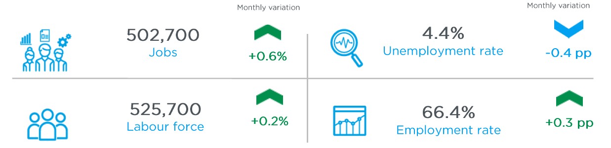 Across the province and Canada, trends show a period of relative stability. The unemployment rates remained unchanged, at 5.7% in the province of Quebec and 7.0% in Canada. However, employment registered a positive variation of +0.1% in both the province and Canada. Although modest, this progression reflects relatively strong labour market conditions outside of the Québec City CMA.
