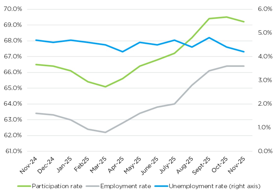 The unemployment rate among the younger population (15–24 years old) was 7.8% in November, based on non-seasonally adjusted data, a drop of 0.6 pp from the previous month. This represents a significant improvement since September 2025, when the unemployment rate for this category peaked at 10.6%. Nevertheless, this metric remains a source of concern. The higher unemployment rate of those aged 15–24 compared to the overall population aged 15 and over is explained in part by structural factors, including the transition from school to work, the higher mobility of younger workers and the higher proportion of people working in temporary or seasonal roles. These factors are amplified by another significant challenge—the accelerated integration of artificial intelligence (AI) redefining the demand for skills. Although the effects cannot yet fully be measured in monthly data, some sectors with low complementarity and high exposition to AI are in a vulnerable position. According to the World Economic Forum (WEF), a high proportion of employers (40%) anticipate reducing their workforce where AI can automate tasks. However, it is worth noting that this transformation is accompanied by a reallocation toward functions with strong AI complementarity, which ultimately will promote job creation and productivity.