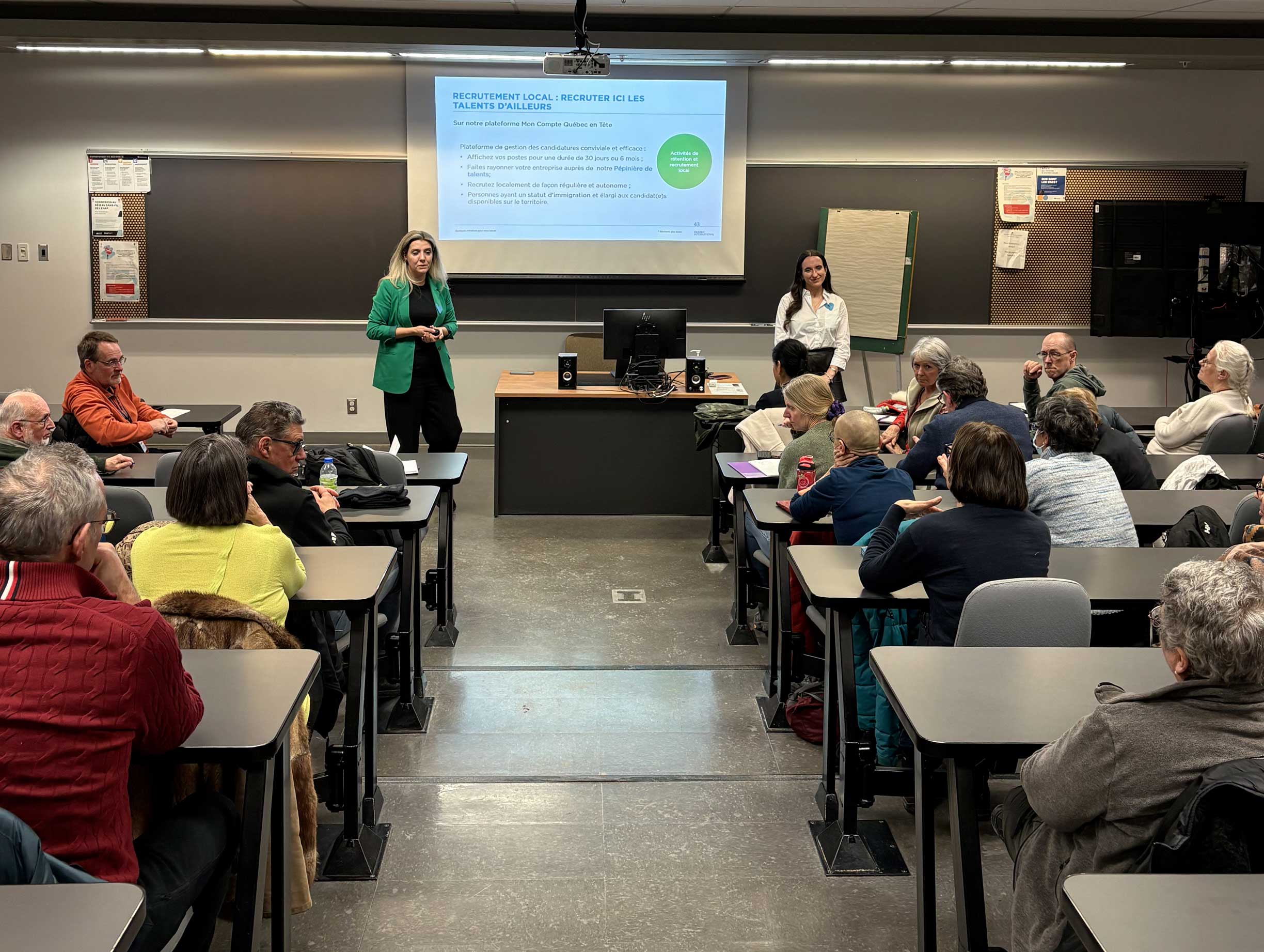 Dans ce contexte, la présentation a permis d’approfondir les différentes étapes du processus de recrutement, tout en expliquant pourquoi les entreprises continuent de se tourner vers des initiatives internationales pour répondre à leurs besoins en main-d’œuvre. Janaïna et Rosalie ont présenté un portrait étoffé de l’attractivité et de la compétitivité de la grande région de Québec, fondé sur l’évolution du marché du travail, les dynamiques démographiques et les perspectives économiques à court et moyen terme. Une attention particulière a été portée aux asymétries actuelles du marché alors que certains secteurs connaissent un ralentissement de l’embauche et que d’autres font face à une pression croissante liée aux risques de pénurie de main-d’œuvre. Cette divergence, de plus en plus marquée, renforce l’importance d’une planification économique capable d’assurer la résilience du tissu productif.